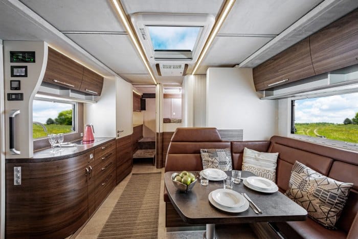 El área extensible transforma el interior en un auténtico salón-comedor, con sofá en L, mesa central y amplias ventanas panorámicas.