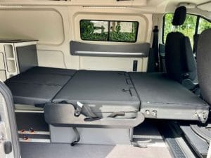 Banqueta de asientos traseros convertible en cama para dos personas en la parte inferior.