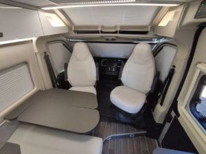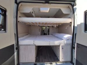 La furgoneta camper Roller Team Livingstone Sport 5 es un vehículo con capacidad para un máximo de 4 personas. En la parte trasera tiene una litera con camas de matrimonio. La cama superior se puede quitar. Cuenta además con una cocina completa, una gran nevera, aseo y ducha.